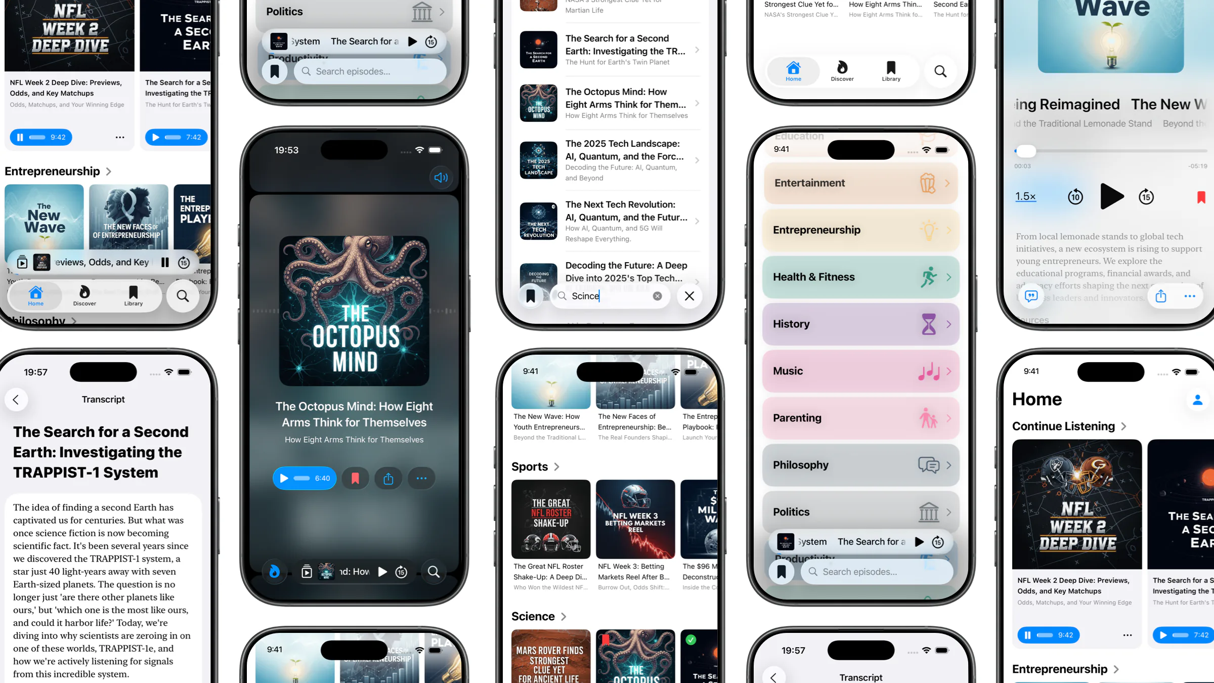 Every episode has a full transcript. Search for a topic, a name, a quote — find the exact moment.